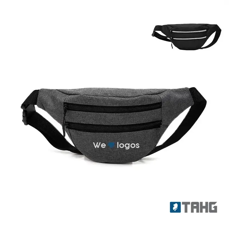 Banano de 600D polyester, duradero y resistente, con dos bolsillos con cierre para mayor seguridad. Cuenta con una correa negra ajustable con broche para un ajuste cómodo.