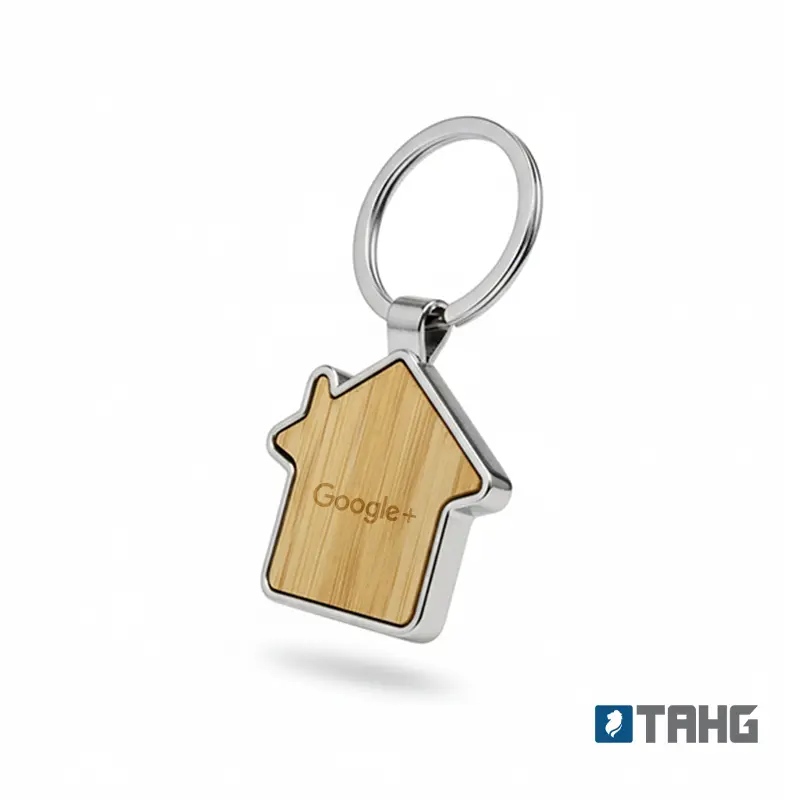 Llavero metálico con silueta de casa y bambú. Fabricado en aleación de zinc y bambú en tono natural. Cuenta con anilla resistente y diseño de casa ideal para branding. Es ideal para inmobiliarias, constructoras, promociones y obsequios corporativos.