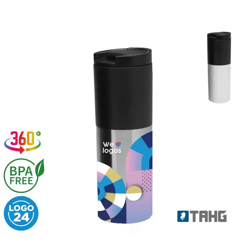 Mug térmico realizado con aluminio e interior de polipropileno negro. Boquilla regulable. Doble pared plástica. Packaging: Caja Impresa. Medidas: 22 cm x Diámetro 7,5 cm. Interior realizado en plástico. Capacidad: 450 ml. Producto libre de BPA. LOGO24: Producto disponible para el servicio de logueo en 24 horas respetando unidades mínimas de logueo y 200 unidades máximas. Consultar términos y condiciones del servicio