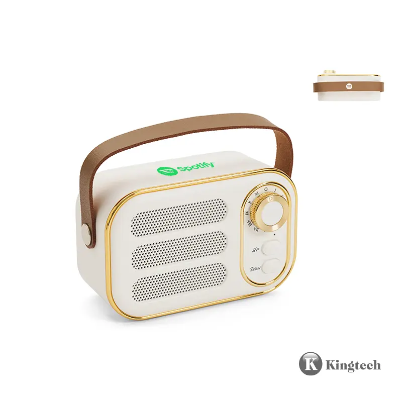 Parlante vintage blanco con correa. Hecho de plástico ABS y cuero PU. Cuenta con correa superior, perilla frontal, botones de control, conexión USB-C, radio FM (87.5–108 MHz), y compatibilidad con Bluetooth, tarjeta TF, USB y entrada AUX. Es ideal para ambientar espacios con estilo retro mientras disfrutás de tu música favorita.